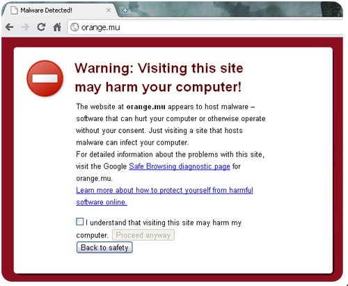 Orange.mu has been marked as a potential source of malware by Google.